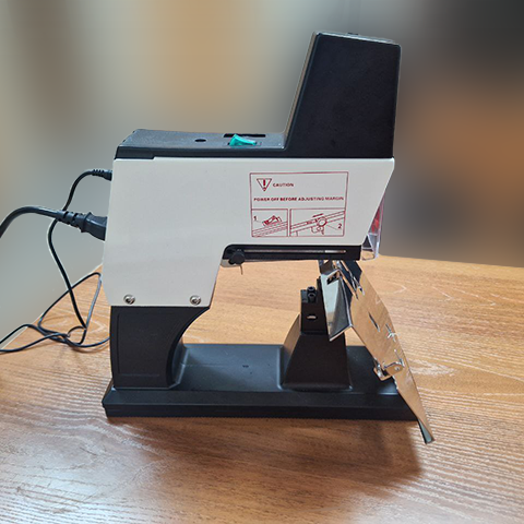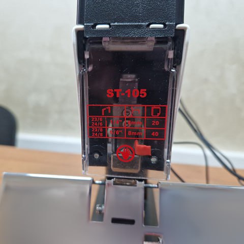 Электрический степлер ST-105 (пр-во КНР) с ножной педалью для скрепления скобами (23/6 — 23/8; 24/6 — 24/8) в тачку или в накидку. В комплекте 3 коробки (3 000 шт.) скоб 23/6.